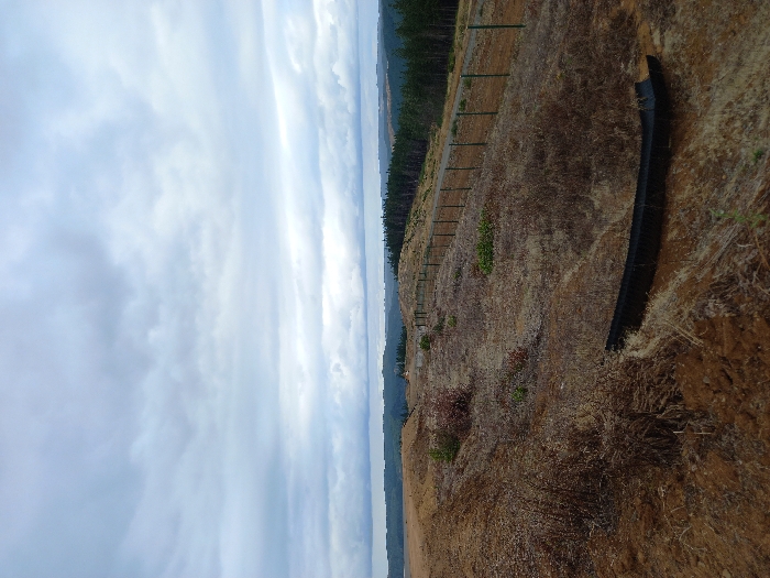 A landscape scene with a sky filled with streaks of clouds. The ground is covered in dry, brown vegetation and dirt, suggesting a hillside or slope. A dark, curved object lies on the ground, possibly a piece of debris or erosion control. A sparse line of posts can be seen along the horizon, potentially part of a fence. Further off, a dark green line of trees forms a horizon against the light sky.