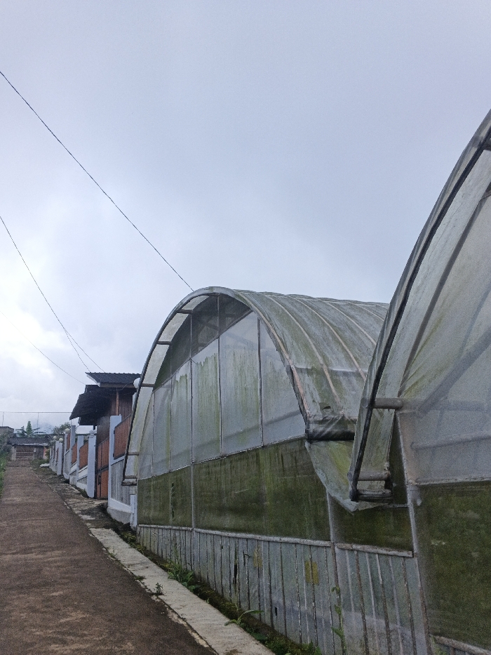 A row of greenhouses stretches along a path under a cloudy sky. The structures are arched, covered with semi-transparent material, and show signs of wear, with some green algae growth. The path is dark and slightly uneven. A fence and houses can be seen in the distance, adding depth to the scene. Power lines stretch across the sky above the structures.