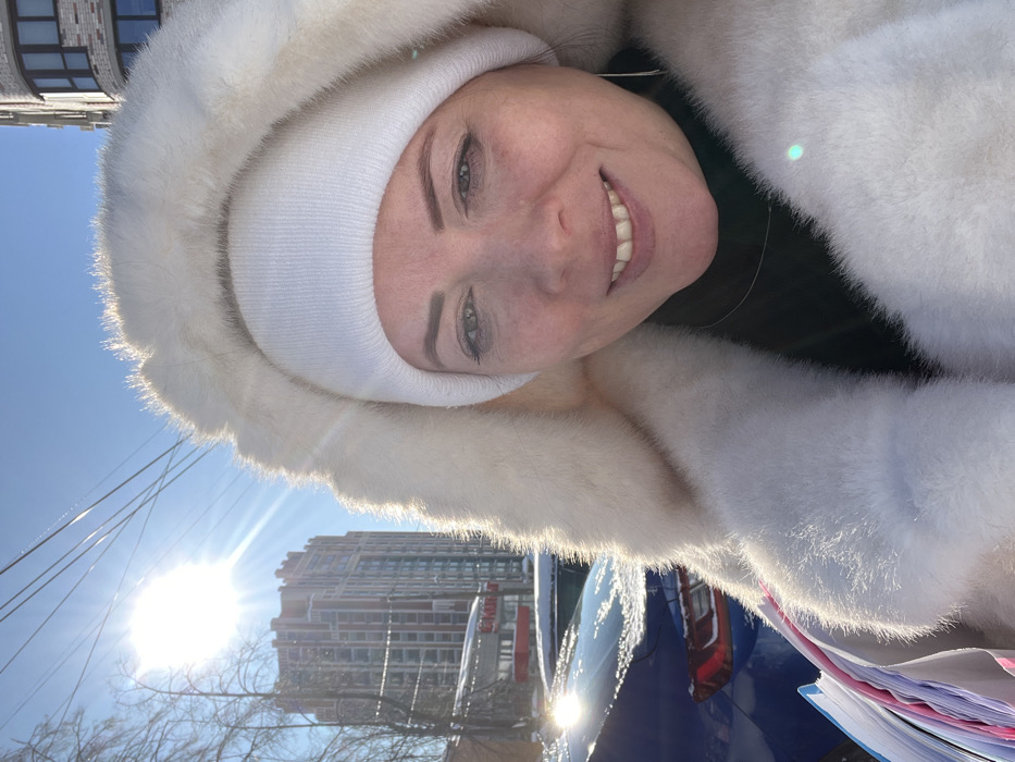 An adult female is depicted in a close-up outdoor portrait, smiling directly into the camera on a clear, sunny winter day in Izhevsk, Russia