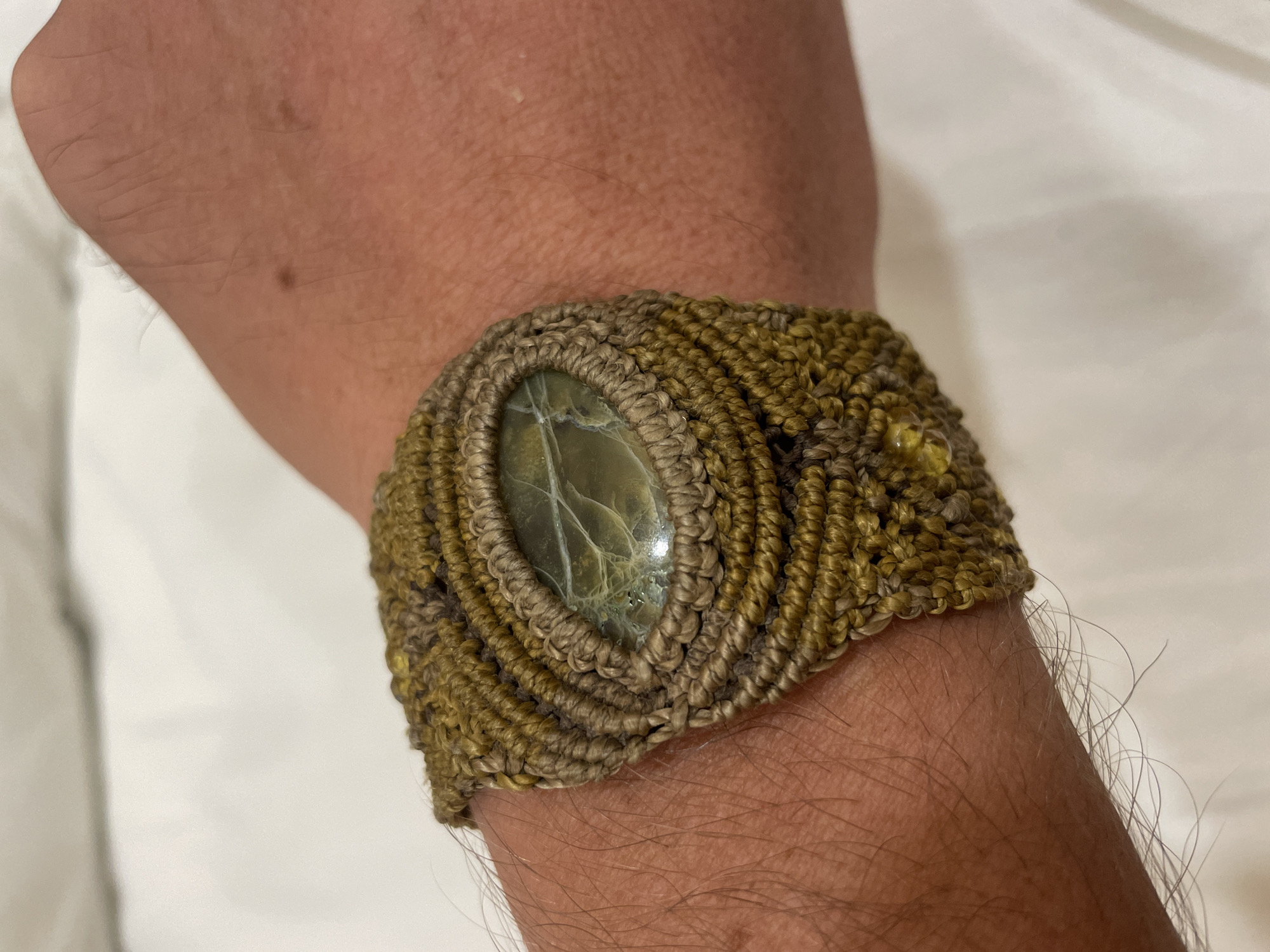A close-up image displays a human forearm and wrist, likely male, against a soft, unfocused light-colored background, within the city of Kolhapur, India. The skin is light to medium toned, covered with fine, dark hairs. A distinct, small, dark brown macule is present on the dorsal side of the forearm. The wrist is adorned with a wide, macramé-style bracelet crafted from interwoven fibers in shades of olive green, khaki, and light brown. This bracelet features an oval-shaped, centrally mounted cabochon stone. The stone is a mottled green color with prominent internal white or pale green veining and surface reflections, indicating a polished finish. Small bright yellow elements are visible within the bracelet's weave. The wrist is positioned so that the bracelet is clearly visible, with the hand out of frame. The environment appears to be an indoor setting with diffuse lighting.