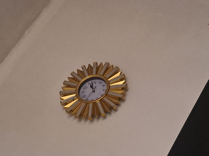 - "The image displays a gold-colored, sunburst-style wall clock mounted on a light-colored, possibly off-white, interior wall" by FM-ktbgJ2, licensed under CC BY 4.0