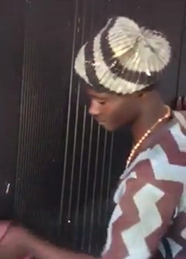 A man wearing a light-colored zig-zag patterned shirt and a striped hat is cleaning a black door