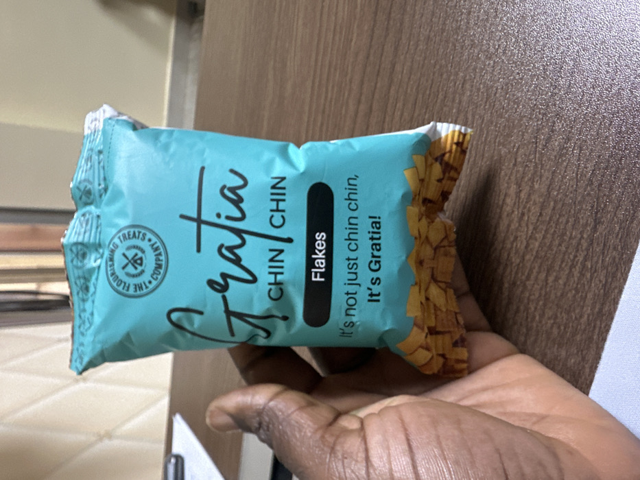 A close-up image, captured at eye-level, displays a human hand holding a turquoise-colored snack package. The hand, with dark skin pigmentation, grasps the left side of the package, with the thumb visible on the front and fingers on the back. The package front is labeled "Gratia CHIN CHIN Flakes" in stylized black text. A circular logo at the top reads "THE FLOURISHING TREATS COMPANY." Below the "Flakes" designation, the slogan "It's not just chin chin, It's Gratia!" is printed. The bottom portion of the package depicts an illustration of numerous small, golden-brown chin chin pieces. The package is sealed with a crimped top edge. The background features a light brown wooden desk surface, partially visible on the right, extending towards the upper right. In the blurred upper left background, a light-colored, possibly paneled wall and a reflective metallic object are discernible. A small section of white paper is visible in the lower left foreground, beneath the hand. The specific location in the city of Shaba, Nigeria, cannot be identified from the visual information presented in this image.
