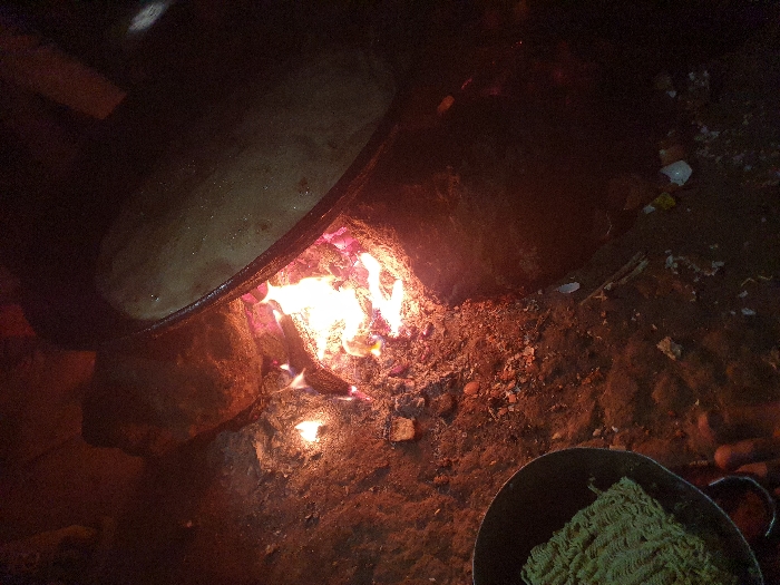 A large pot sits over a crackling fire, likely used for cooking. The fire illuminates the surrounding ground, covered in dirt and debris. In the lower right corner, a smaller pot contains what appears to be a block of dried noodles, suggesting a simple meal being prepared. The dark background suggests an outdoor cooking setting at night.