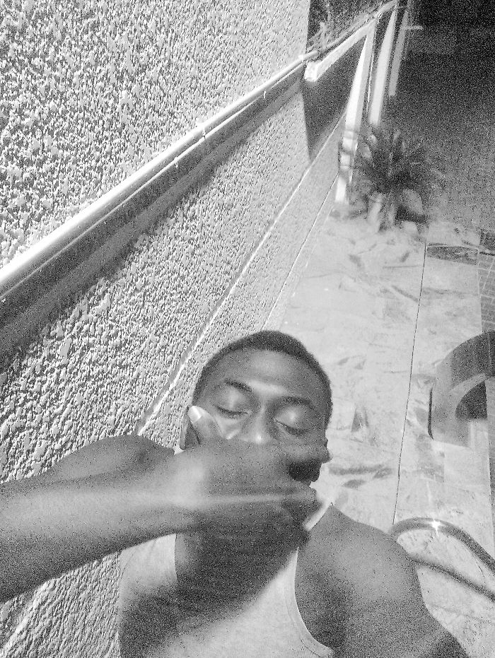 A man closes his eyes, his hand covering his mouth, possibly obscuring a smile or laugh. He is wearing a tank top. The photo is taken outside with a textured wall on one side and a tiled or stone surface extending to the right. A railing or pipe runs along the wall, and a small potted plant is visible in the background. The image is in grayscale, with moderate levels of visible noise.