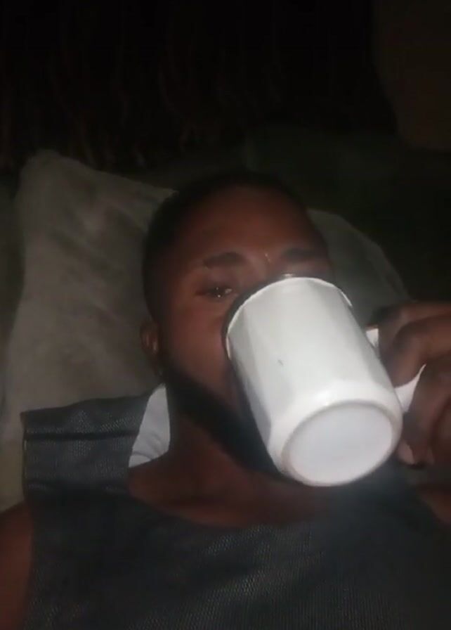 A person with brown skin and short dark hair is shown from the chest up lying down on a pillow. The person is drinking from a white mug, and looks at the camera and smiles. The person is wearing a gray tank top. The background is dark.