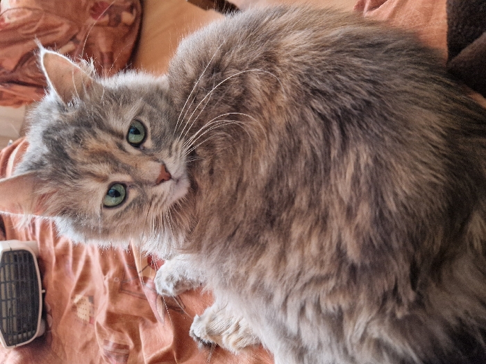 The image depicts a domestic cat situated in an indoor environment within the city of Lovech, Bulgaria. The cat, identified as a long-haired or semi-long-haired individual, exhibits a multi-colored "torbie" or "patched tabby" coat with prominent grey, brown, and ginger/cream markings. Its eyes are green, and long white whiskers extend from its muzzle. The cat is lying on an orange or peach-colored patterned fabric, possibly bedding, with its body angled upwards and its head tilted slightly, looking directly towards the viewer. In the upper left background, a small, white, portable electric fan heater with a dark grill is visible on the same patterned fabric. A darker brown fabric is present in the lower right portion of the frame. No human figures are present.