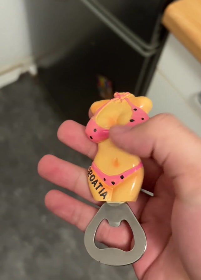 A hand holds a bottle opener shaped like a woman's torso wearing a pink bikini. The bottle opener is primarily tan, with the word "CROATIA" written on one of the bikini bottoms. The background includes a black refrigerator and a wooden countertop.