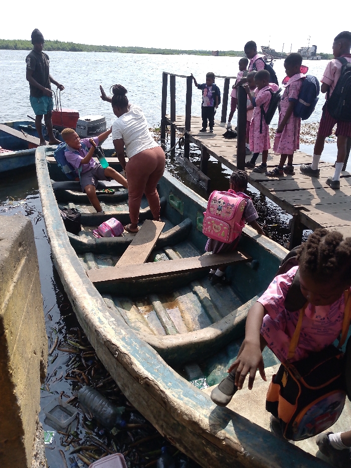 The image captures a bustling waterfront scene at a lagoon-side community in Lagos, Nigeria, on a clear, sunny day. A large, weathered light blue wooden boat, showing significant wear, is positioned in the foreground next to a concrete embankment. The water around the boat is murky and contains numerous plastic bottles, containers, and organic debris. Ten individuals are present: two adults and eight children. An adult female, wearing a white short-sleeved top and brown pants, stands in the main boat, assisting a boy in a pink school uniform, dark shorts, and a blue backpack, who is actively navigating into or out of the boat while holding a blue water bottle. Another girl in a pink uniform and pink backpack sits on a wooden plank inside the boat, facing away from the camera. In the extreme foreground, a third girl, also in a pink uniform and an orange and black backpack, leans into the boat. To the left, an adult male, dressed in a dark t-shirt, shorts, and a dark beanie, stands in a smaller, darker blue boat, holding ropes. To the right, a rudimentary wooden jetty with dark posts and horizontal planks extends into the water. Six additional children, mostly dressed in similar pink school uniforms with various backpacks (dark blue, black), stand on this jetty, observing the activity. One younger child in a black outfit is also visible on the jetty. In the background, across the calm water, a low-lying landmass with sparse vegetation is visible, along with a distant vessel or structure.