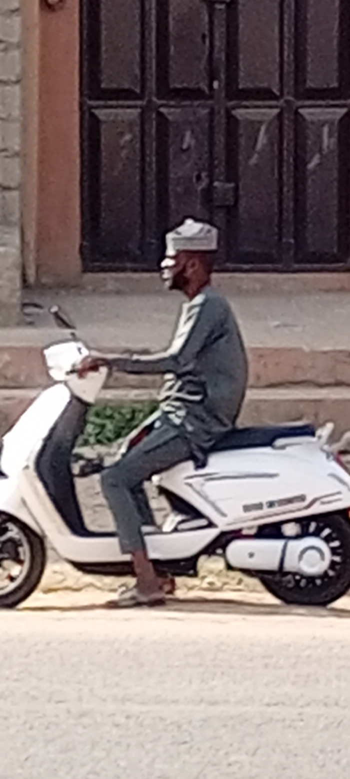 - "A male individual is depicted seated on a white scooter on a paved road in Kabuga, Nigeria" by FM-oATT32, licensed under CC BY 4.0