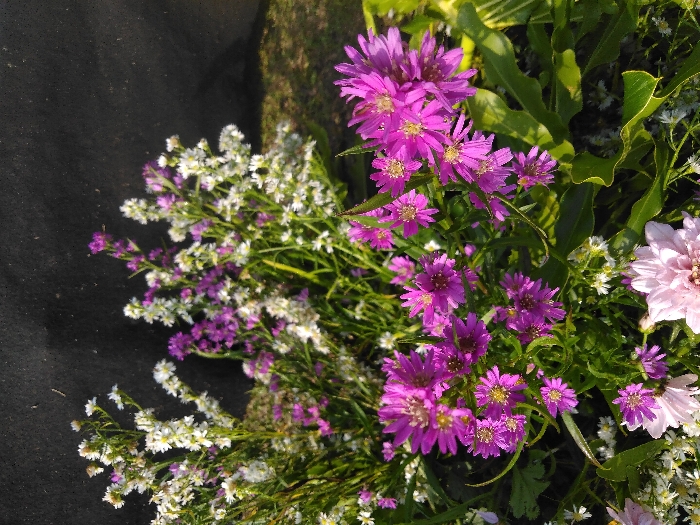 The image displays a close-up of a diverse floral grouping. The specific location within Potočná, Czechia, is not discernible from the visual content. The foreground features clusters of small, vivid magenta-purple flowers with yellow centers, intermingled with smaller white flowers, some exhibiting greenish-yellow centers. Partially visible in the bottom foreground are larger, light pink, multi-petaled flowers. Green foliage, with some serrated leaves, surrounds the blooms. The background is a uniform dark, non-reflective surface, likely black fabric or a wall. The scene is lit by bright, natural illumination, creating highlights and minor shadows on the vegetation.
