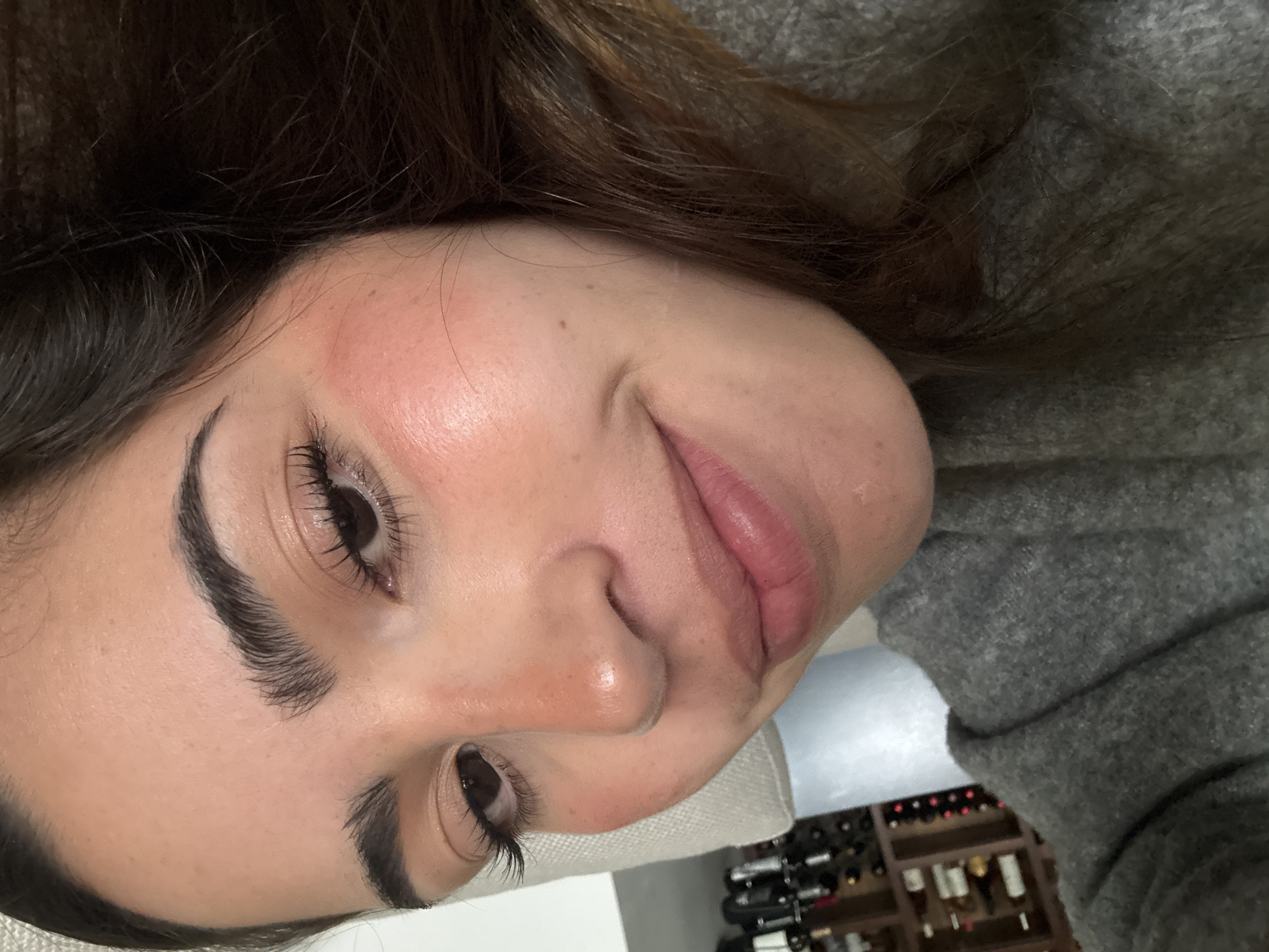 A close-up photograph shows a woman with brown hair and fair skin lying down. Her right cheek appears flushed. She has thick, dark eyebrows and long eyelashes. Part of her face rests on a white surface, possibly a pillow or medical paper. In the background, out of focus, are several bottles arranged on shelves. Based on the location provided, this might be a residential or commercial setting in San Bernardino Tlaxcalancingo, Mexico.