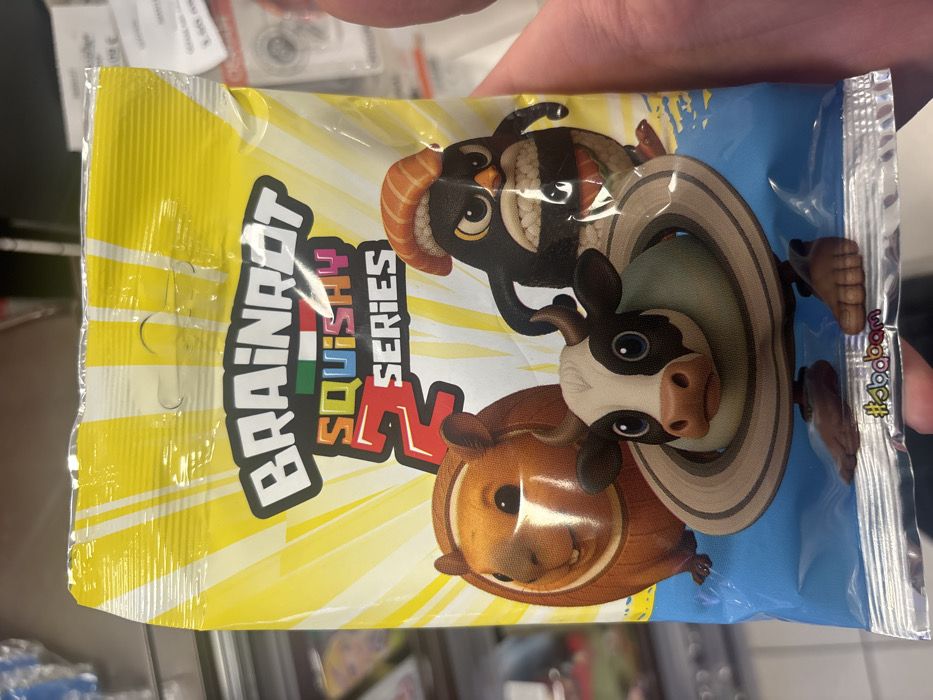 A light-skinned right hand holds a glossy, flexible plastic pouch, consistent with retail product packaging. The pouch's design features a bright yellow background with radiating white lines transitioning to a blue lower section with white splashes. Prominently displayed text reads "BRAINROT SQUISHY SERIES 2," with a small Italian flag icon integrated into "SQUISHY." Three cartoon characters are illustrated on the pouch: a smiling, cylindrical brown creature resembling a guinea pig on the left; an angry black penguin wearing a salmon sushi piece as a hat on the right; and a central figure combining a black and white cow's head with a Saturn-like ring structure, from which two dark-skinned human feet extend downwards. The hashtag "#dooboom" is printed at the bottom center of the pouch. The top edge of the packaging is heat-sealed, featuring two circular punched holes for hanging. The background is an out-of-focus indoor retail environment, showing blurred shelving units stocked with other products and white labels, indicating a commercial setting in the city of Studena, Bulgaria.