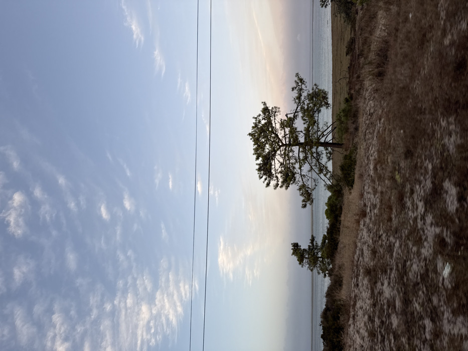 This image captures a serene coastal or estuarine landscape within the municipality of Grândola, Portugal, likely featuring an area near the Atlantic coast or the Sado Estuary. The scene is devoid of human or animal subjects, focusing on natural elements and minimal infrastructure. The upper portion of the frame is dominated by a light blue sky, transitioning from a pale hue near the horizon to a slightly deeper blue at the zenith. Wispy, scattered cirrus and cirrocumulus clouds are visible, distributed unevenly across the sky, with denser formations on the left. Two thin, dark horizontal utility wires traverse the sky horizontally, positioned approximately one-third down from the top edge of the image. Below the sky, a calm, expansive body of water stretches horizontally across the mid-ground, exhibiting a light blue-green tint. The water's surface is smooth, with no discernible waves, suggesting either still conditions or a sheltered inlet. Separating the water from the foreground is a strip of land comprising sandy terrain and sparse vegetation. A prominent, mature pine tree, likely a maritime pine, stands slightly to the right of the image's center, on an elevated sandy bank. Its canopy is full of dark green needles, and its branches extend broadly. A smaller, less developed pine tree is situated to its left, closer to the water's edge. Patches of darker green shrubs and areas of dry, light brown grass are interspersed among the trees and along the water's edge. The foreground consists of uneven, sandy ground characterized by a mixture of dry, light brown-orange vegetation and exposed darker earth. The texture suggests a coastal dune or scrubland environment. The lighting is soft and diffuse, with a faint pinkish-peach glow near the horizon, indicating either dawn or dusk.