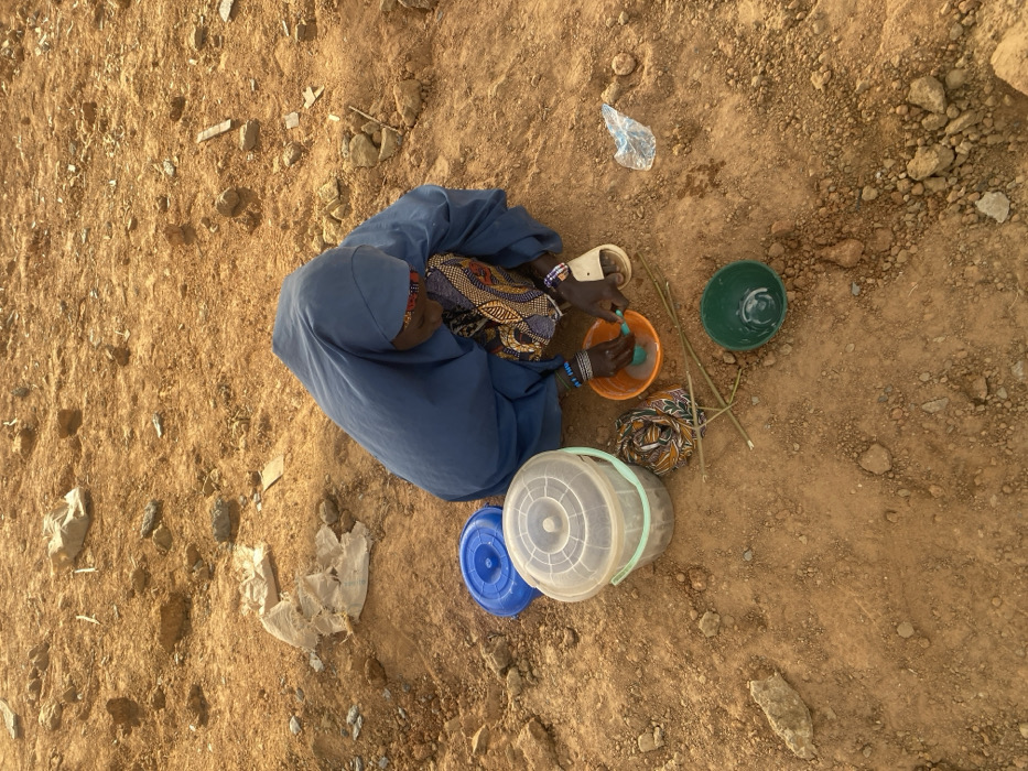 An aerial view shows a person in a blue robe and head covering washing dishes in a dusty, rocky landscape. Various containers, including a translucent bucket with a blue lid and an orange bowl, surround the individual. A pair of sandals rests near the bowl as the person's hands are submerged in the water. Debris, like plastic bags, and a green bowl are scattered nearby on the dry ground. A patterned cloth rests near the buckets.