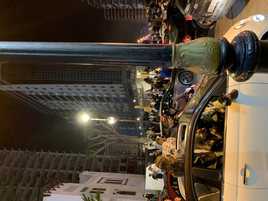 This nighttime image captures a bustling urban street scene on Avenue Mohammed VI (the Corniche) in Tangier, Morocco, characterized by heavy traffic and numerous pedestrians. In the immediate foreground on the right, a decorative black lamppost with an ornate, light-colored base partially obscures the view. To its left, a white two-door compact car is stationary, with its sunroof open. A woman with long brown hair stands through the sunroof, facing away from the camera, holding a mobile phone. Another woman with blonde hair is visible in the driver's seat, also holding a phone. Behind the white car, the street is gridlocked with multiple vehicles, predominantly sedans and SUVs. A dark grey sedan is visible to the left of the white car. A man wearing a black helmet is seated in the driver's position of what appears to be a scooter or motorcycle, positioned between the white and dark grey cars, smiling and interacting with two men leaning into the dark grey sedan. One of these men wears a light-colored, patterned short-sleeved shirt. Further back on the right, a black SUV with a partially visible Moroccan license plate ("50070 MA") is also stationary. A large crowd of people occupies the sidewalks and spills onto the street among the vehicles. Many individuals are standing, conversing, and observing the scene. The background features a mix of architectural styles. On the far left, a white multi-story building with distinct arched windows and decorative elements is partially visible. Adjacent to it stands a tall, unfinished concrete building skeleton, exposing multiple floors and structural elements. To the right of this, a modern high-rise building with a dark glass facade and illuminated windows features a "Sky" sign on its lower levels. Other multi-story buildings line the street, with a "Crêpes Glacier" sign visible on one. The scene is illuminated by numerous streetlights, including a prominent double-globe lamppost in the mid-background, as well as vehicle headlights and ambient light from buildings. The sky is dark.