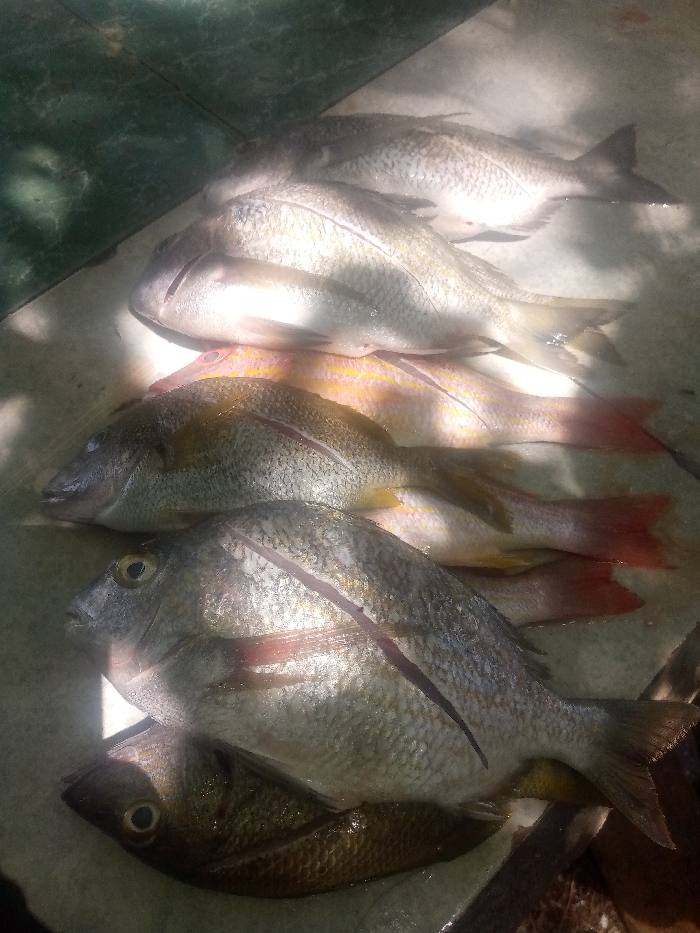 - "The image displays a collection of approximately nine freshly caught fish laid out on a light-colored, possibly concrete or tiled surface, adjacent to a darker green tiled area, in the city of Las Guevaras, Venezuela" by FM-Q5qB73, licensed under CC BY 4.0