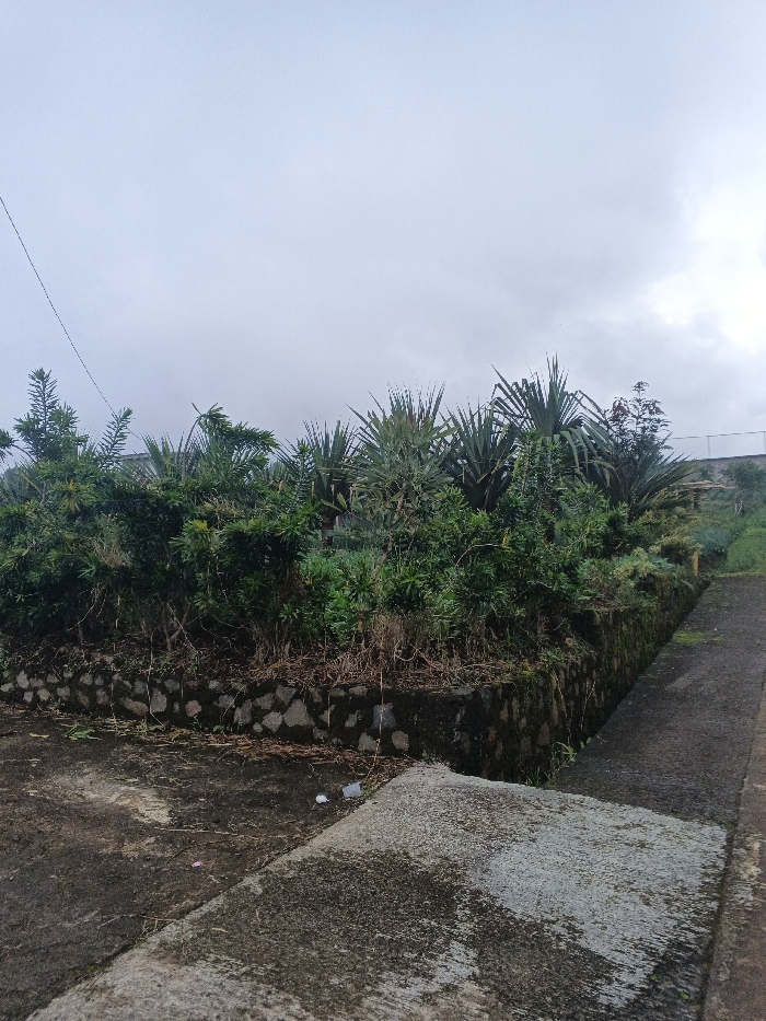 A low stone wall supports a dense collection of various green plants, filling a long planter. A narrow concrete pathway runs along the far side of the planter. In the foreground, a rough, gray concrete surface meets the path at an angle. Above, a cloudy sky obscures the view. A power line stretches across the upper-left portion of the image. Debris litters the ground near the wall's base.