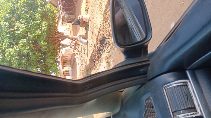 The view is from inside a car, showing an exterior scene through the open driver's side window and reflected in the side mirror. A lush green tree stands beside a building, under a bright sky. Two people are visible outside, engaged in an activity with a container. The setting appears to be a rural area, possibly a village, with signs of modest structures.