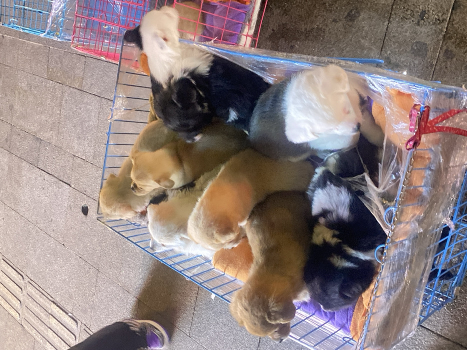 A wire crate is filled with sleeping puppies, some golden and others black and white. The crate is partially covered with clear plastic, secured with a red tie. Another crate, red and wire, is visible in the background. The scene is set on a sidewalk. Part of a person's leg and shoe are visible in the lower left corner.