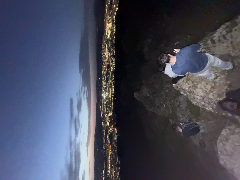 The image captures a night scene from an elevated rocky vantage point overlooking the city of Bragança, Portugal. Four individuals are positioned in the dark, rugged foreground. In the center, a person wearing a dark blue long-sleeved shirt and light grey pants stands or crouches, facing away from the camera, holding a white smartphone with a colorful case towards the illuminated city below. Behind and slightly to their left, another individual in a light grey hoodie is seated or crouching, also facing the city. To the left and lower on the rocky incline, a third person in a dark striped shirt is seen looking at an illuminated smartphone screen held in their hands. A fourth person, wearing a dark hoodie, is partially visible in the lower-left corner, looking downwards. The sky above is dark blue, transitioning to lighter blues, subtle pinks, and oranges along the distant horizon, with scattered dark clouds present. The city of Bragança spreads across the midground, densely lit by a multitude of yellow and white artificial lights. Dark, undulating hills define the distant horizon beneath the twilight sky. The immediate foreground consists of uneven, dark rock formations and sparse vegetation.