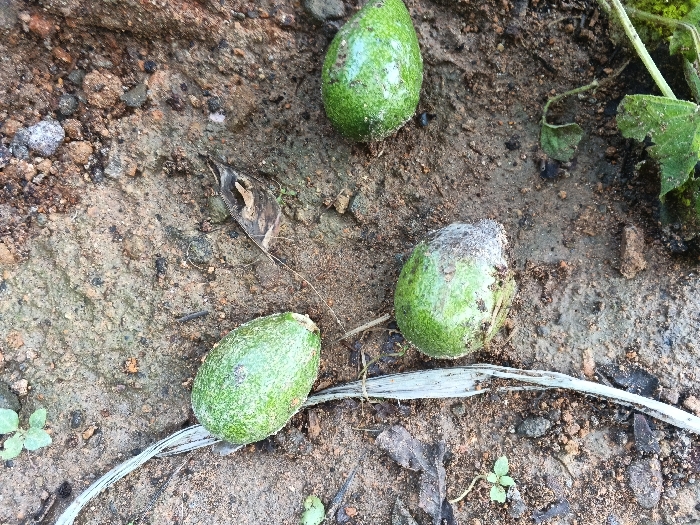 Three small, green avocados lie on the ground amid soil, small rocks, and scattered plant debris