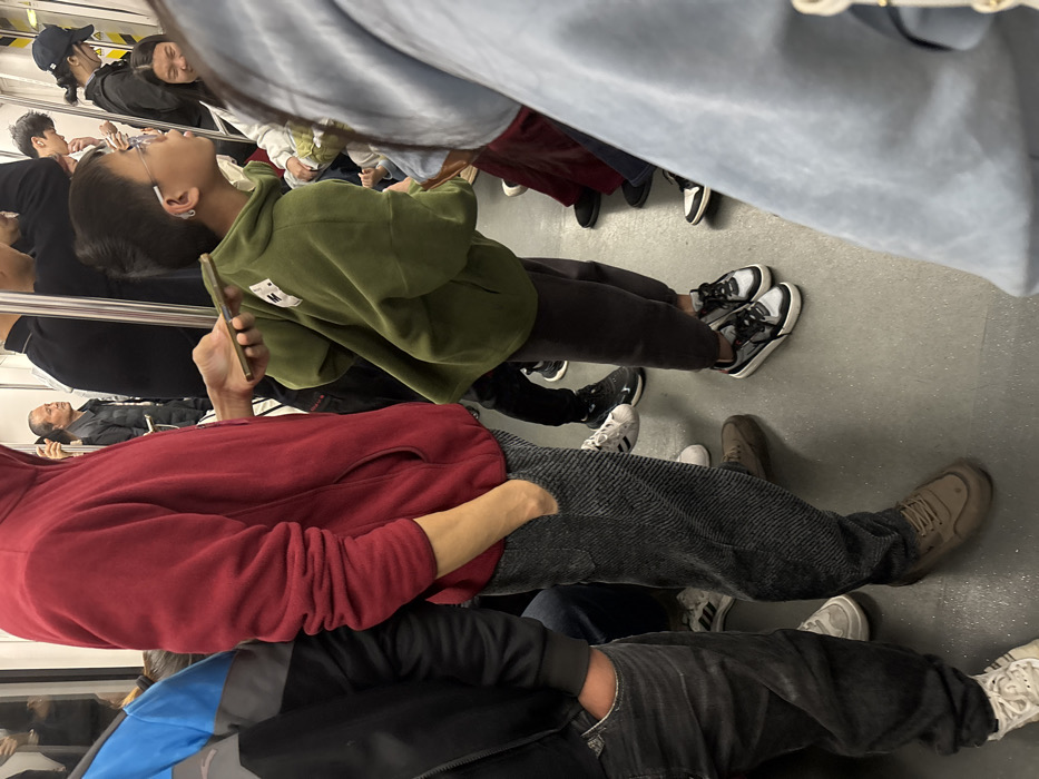 A group of people stands closely together in a subway car, suggesting a crowded commute. Visible are parts of their bodies from the chest down, showcasing casual clothing like hoodies, pants, and a variety of shoe styles. A person in a green hoodie looks upward while holding a phone. The close proximity and mixed attire indicate a diverse group of individuals traveling together in an urban setting.