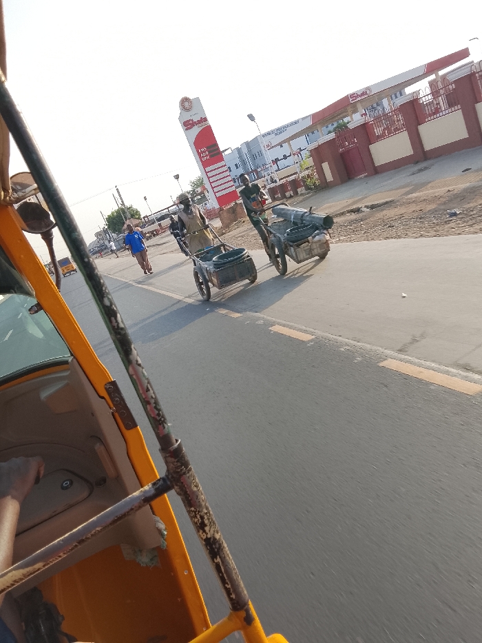 A yellow auto-rickshaw's interior is visible on the left. Two men are pulling carts along a road. The first man's cart contains a large black container, while the second man's cart carries pipes, tires, and other objects. In the background, a gas station with a tall sign is visible. A person in a blue shirt walks along the sidewalk towards the gas station.