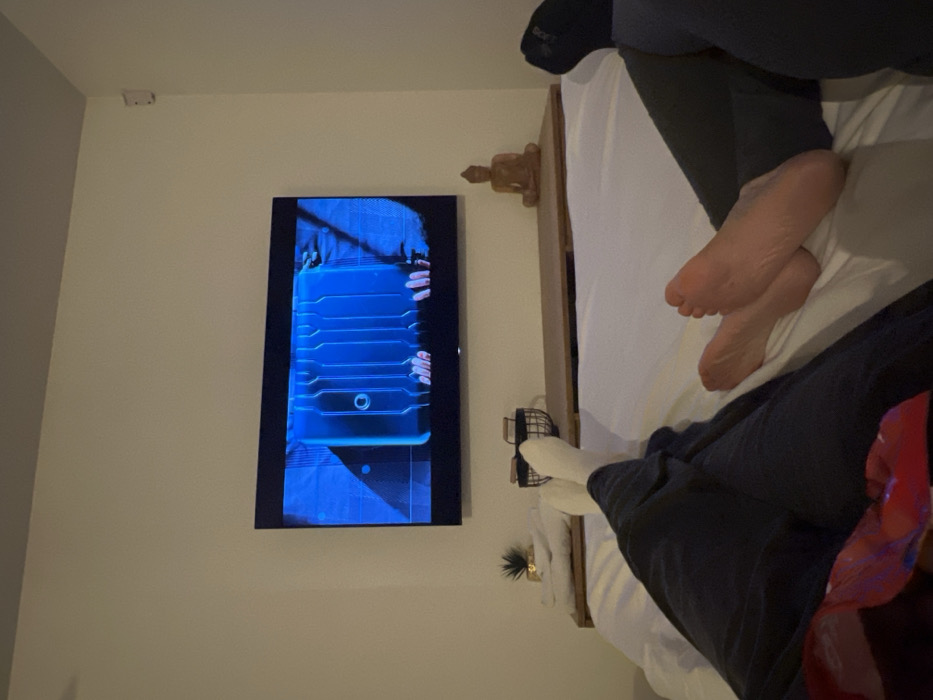 The image depicts two people laying on a bed with their feet visible. They are watching a movie on a large flat-screen television mounted on the wall in front of them. The television screen shows a scene with a blue-colored background. The bed is white with a white blanket. The bed is against a wall with a wooden shelf above it. On the shelf is a small potted plant, a small wicker basket, and a small wooden statue. The scene is located in a bedroom in Annecy, France. The GPS coordinates are 45.895, 6.13. The bedroom has white walls and beige carpet. The room is well lit with natural light coming through the windows. The people are wearing comfortable clothing, and the room is generally tidy. The scene appears to be peaceful and relaxed.