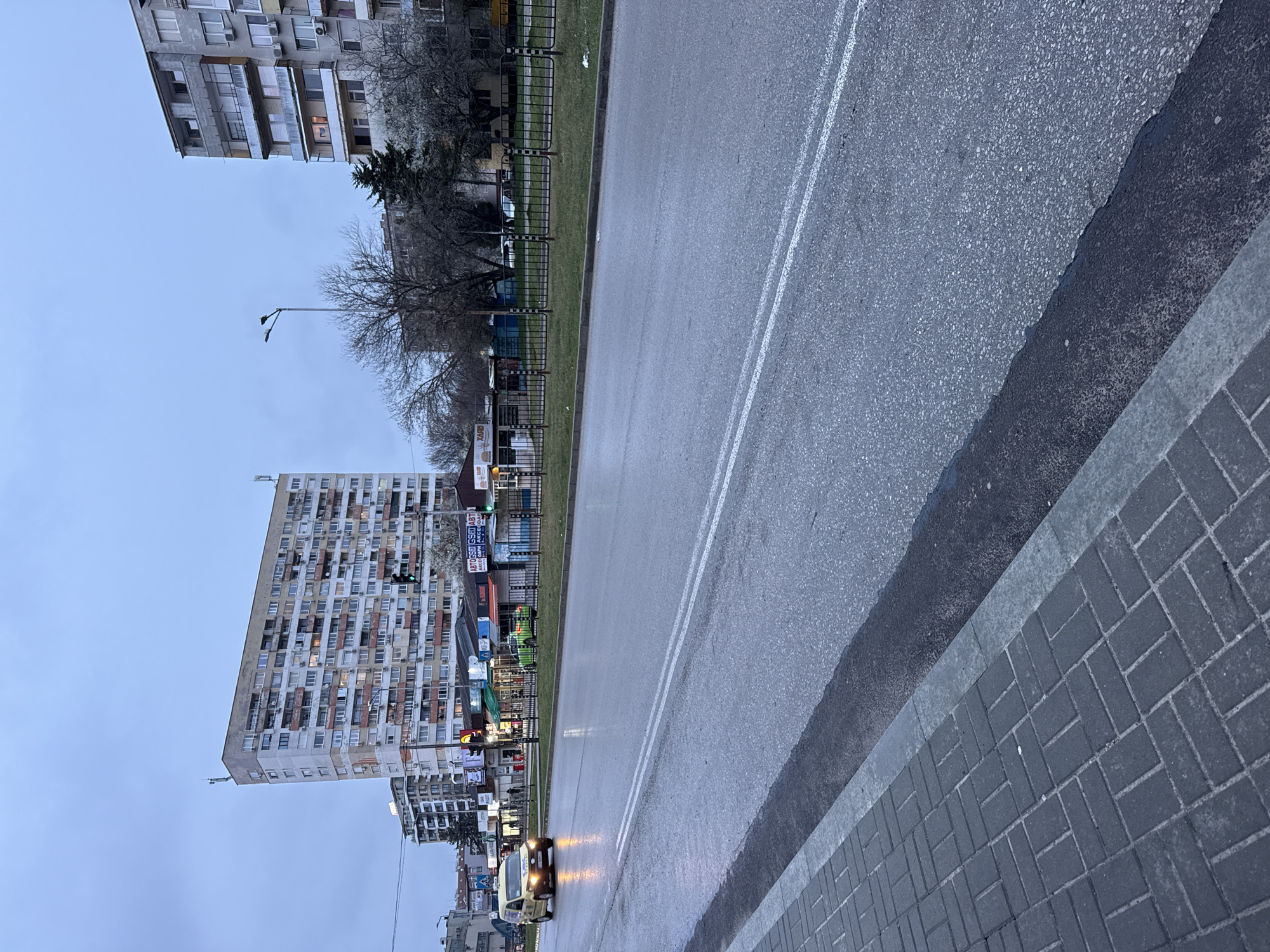 The image captures a street scene in Sofia, Bulgaria, likely on a damp, overcast day. **Environment:** The scene is dominated by a wide asphalt road with double white lane markings. To the right is a sidewalk paved with gray rectangular stones. On the left side of the road, there is a grassy median strip bordered by a metal fence. Tall residential buildings flank the scene, typical of Eastern European urban architecture. The sky is uniformly gray, suggesting either early morning or a cloudy day. **Objects:** Several objects are visible along the street: * Buildings: High-rise apartment buildings line the left side of the frame. Their architecture appears to be from the Soviet era. * Vehicles: A few cars are visible on the road, with their headlights illuminated. * Street Furniture: There are streetlights and other urban fixtures along the median. **Location Clues:** The architecture and signage suggest the location is Sofia, Bulgaria. The type of buildings and street layout is common in neighborhoods built during the communist era.