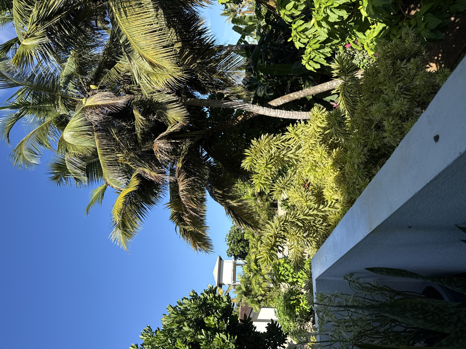 A vibrant scene displays a tall coconut palm tree angled against a clear blue sky. Lush greenery, including various shrubs and leafy plants, fills the background, juxtaposed with a bright white wall in the foreground. In the distance, a water tower rises above the trees, adding depth to the composition. The overall impression is one of tropical beauty and tranquility.