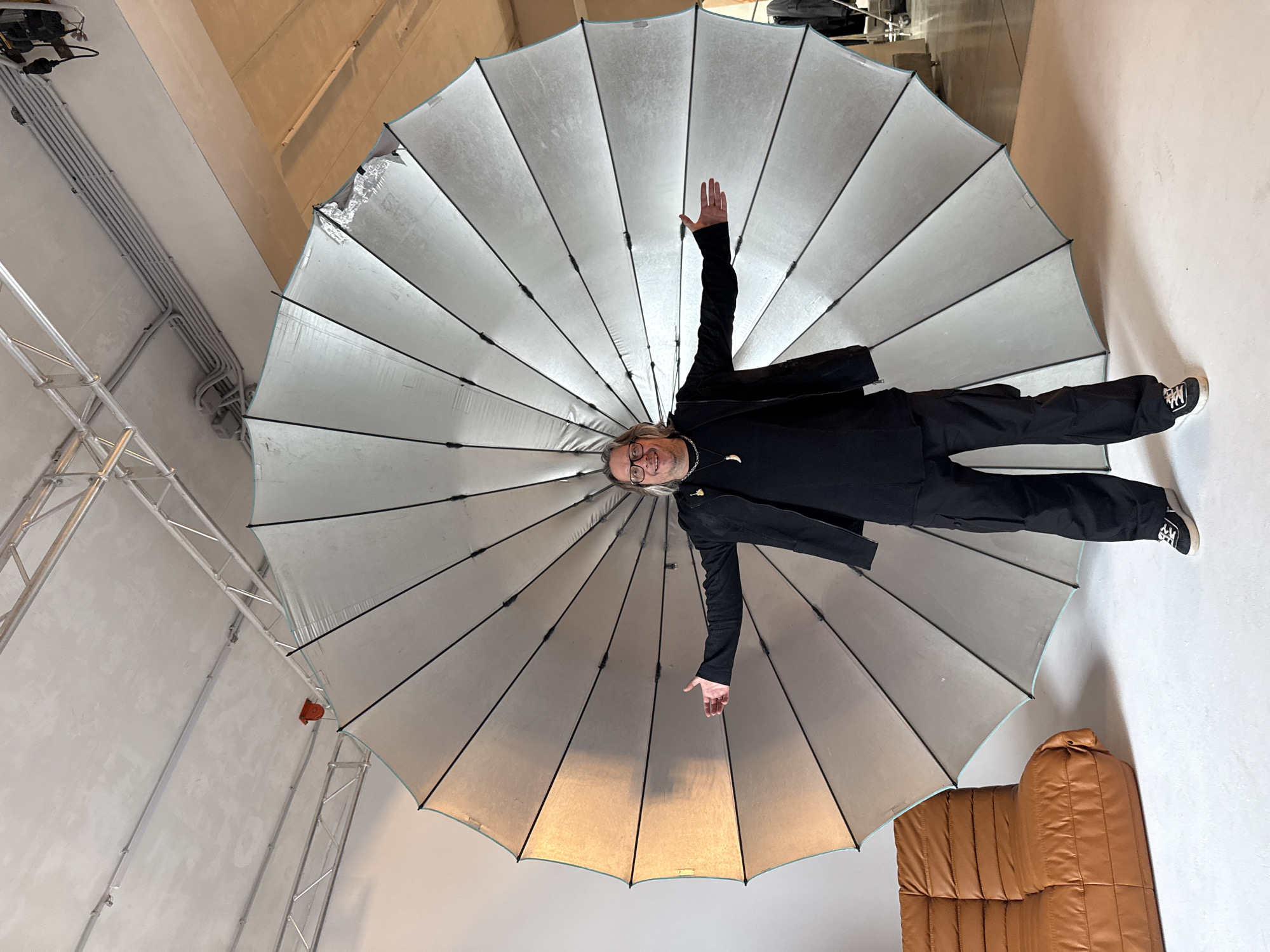 A man wearing glasses and black clothing stands underneath a large, silver lighting umbrella in an indoor space