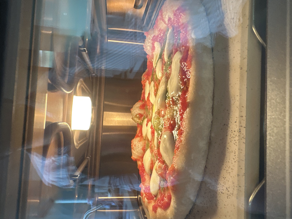 - "An uncooked or partially cooked pizza is centered within a modern, stainless steel oven, viewed through its reflective glass door" by FM-IS41v2, licensed under CC BY 4.0
