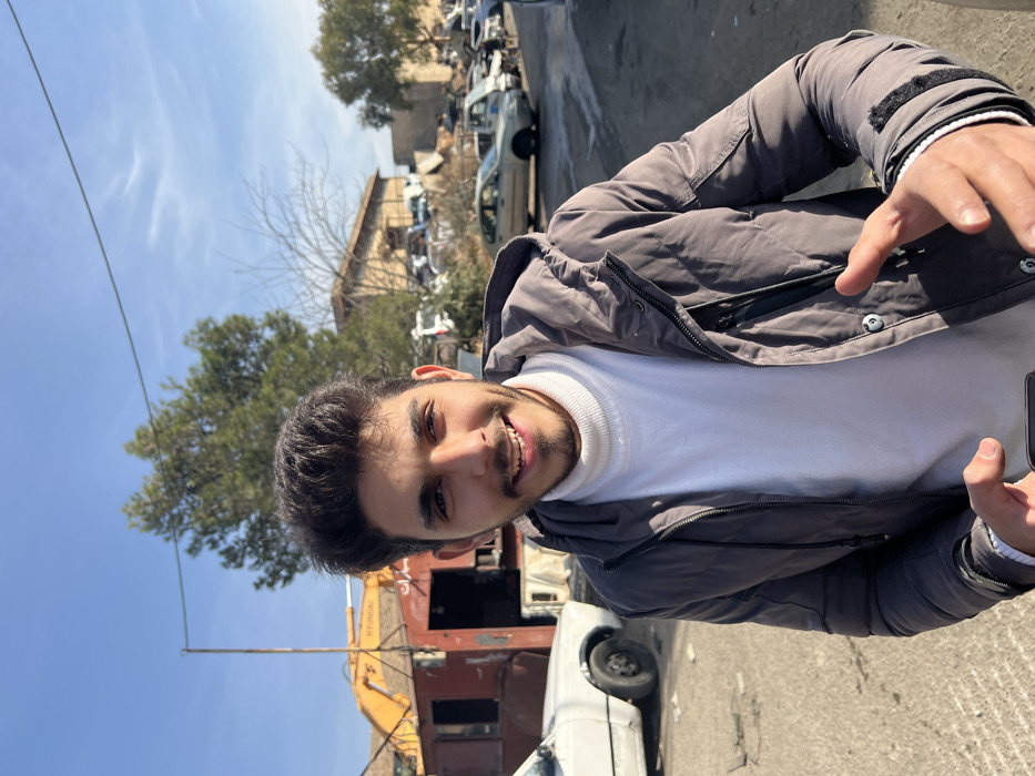 A young adult male, with dark hair and a short beard, smiles broadly at the camera. He wears a white turtleneck sweater and a dark grey hooded puffer jacket. His left hand is partially visible holding a smartphone, and his right hand is raised in a gesture. The scene is an outdoor automotive junkyard or repair facility in At-Tall, Syria, under a clear blue sky with sparse white clouds. To the left, a white car is partially visible, behind which stands a reddish-brown corrugated metal structure, possibly a small shop, with Arabic text reading "سيارات" (Sayarat - Cars). A yellow Hyundai excavator boom is visible behind this structure. To the right and in the background, numerous cars, many appearing old or partially disassembled, are parked on a mix of paved and unpaved ground. More vehicles are visible on a slightly elevated area in the distant background, interspersed with trees and an indistinct building.