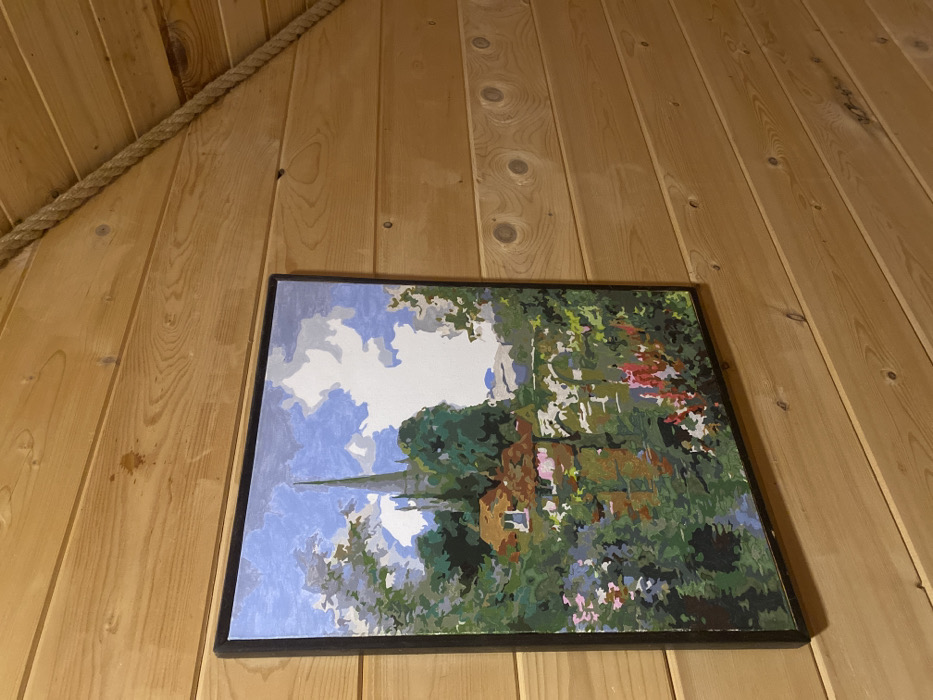 A framed painting hangs on a light-colored wooden-paneled wall within a structure in Прикамский, Russia