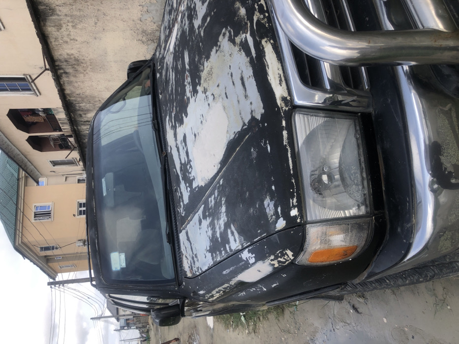 A black SUV, likely a Toyota 4Runner, is parked on an unpaved, damp dirt road in a residential area of Lagos, Nigeria. The vehicle's paint is extensively deteriorated, with large patches of original black peeling from the hood and front fenders, exposing lighter undercoat. It features a chrome front bumper, a chrome grille, clear headlights with amber turn signals, and a prominent chrome bull bar. Two white rectangular stickers are affixed to the upper left interior of the windshield. In the background, a light yellow two-story building with a green pitched roof and multiple windows is visible on the left. To the right, a cream-colored building with arched balcony openings displays drying laundry, separated by a textured concrete wall topped with defensive elements. Overhead utility wires traverse the scene, connected to a wooden pole on the left. A person's lower left leg and foot are partially visible on the far left, moving away from the camera. The sky is overcast.