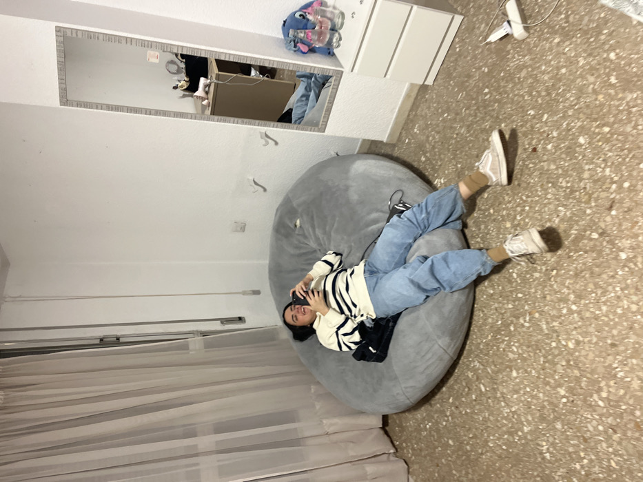 - "An individual is seen reclining on a large, grey bean bag chair in an indoor room" by FM-mrTCs1, licensed under CC BY 4.0