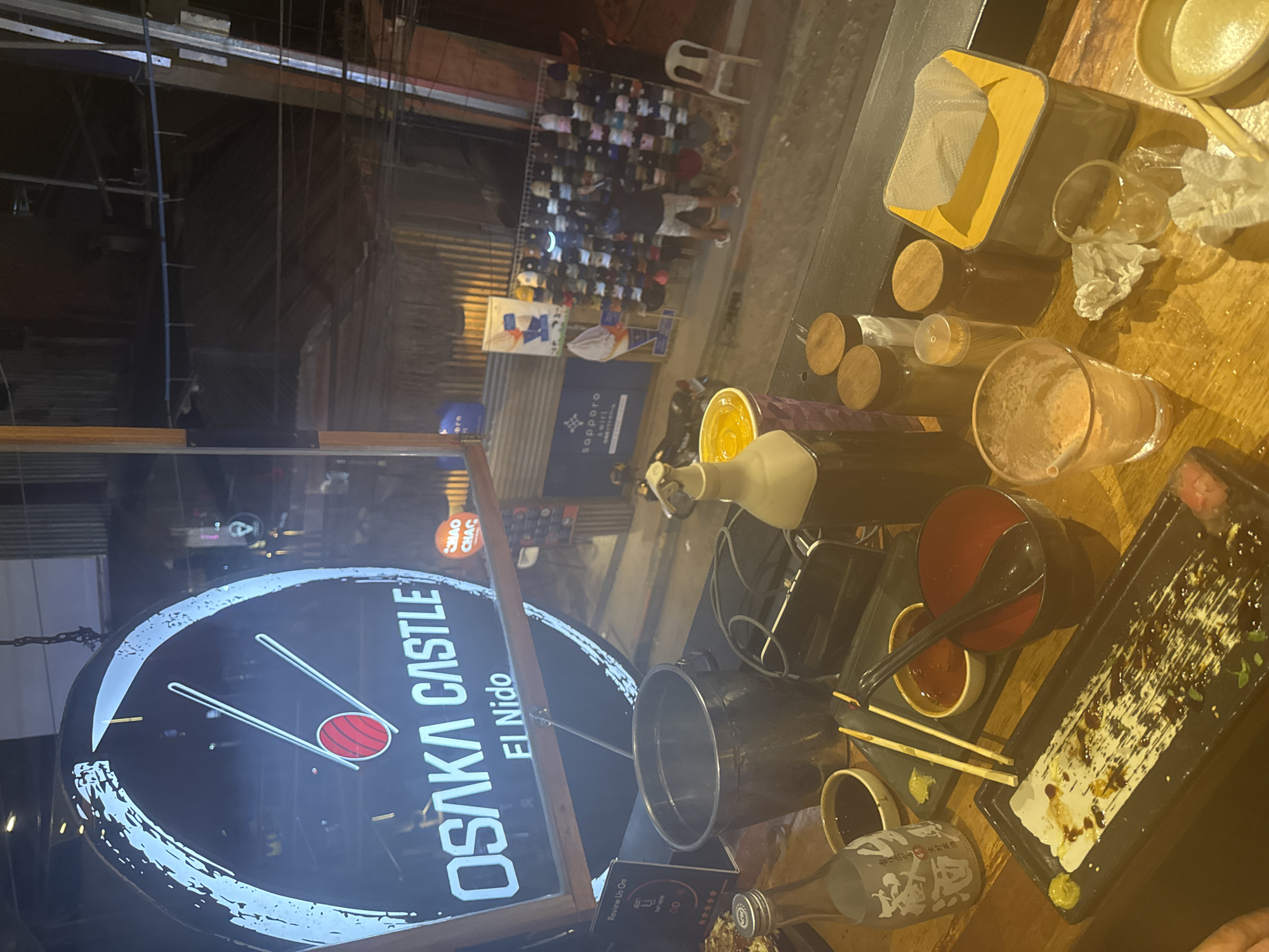 The image depicts an outdoor dining table at Osaka Castle, El Nido, Philippines. The table is covered with remnants of a meal, including dirty dishes (bowls, a plate, and small condiment dishes), chopsticks, a glass with a straw, and bottles. The sign for "Osaka Castle El Nido" is visible in the lower left. In the background, a street scene is visible with people and shops.