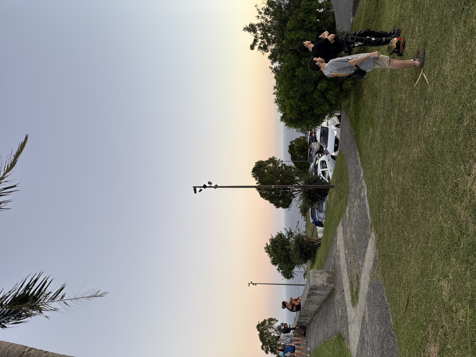 The image depicts an elevated coastal park area in Noumea, France, likely Ouen Toro Park, at either dusk or dawn, characterized by a gradient sky transitioning from light blue overhead to pale orange and pink at the horizon. In the foreground, lush green grass covers the ground, with two men standing on the right. The man on the left wears a light t-shirt and shorts with a dark bag, while the man on the right wears a dark t-shirt and dark pants, with his arms crossed. A black and red motorcycle helmet rests on the grass near his feet. A paved, dark grey path winds through the grassy terrain, visible in the lower left and mid-ground. In the mid-ground, a concrete barrier or wall runs along the left side of the path. A group of approximately five individuals are gathered around this wall; one person is seated on top of it, facing right. Further right, a tall, black multi-directional lamppost stands prominently amidst green trees and bushes. Below this, a car park is visible, containing several parked vehicles, including a white SUV, a white hatchback, and a dark blue vehicle. The background reveals the vast, calm ocean stretching to the horizon, visible between the trees and above the car park. Another similar lamppost and additional trees are present further left in the mid-ground. The upper left of the frame shows partial fronds of a palm tree.
