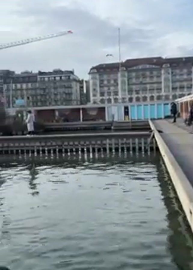 The video pans across a waterfront scene. People are sitting and standing on a long dock. A colorful boat sits in the water next to the dock. In the distance, there are buildings and construction cranes. Ducks swim in the water. Tables and chairs are set up on a terrace where people are sitting. The sky is overcast.