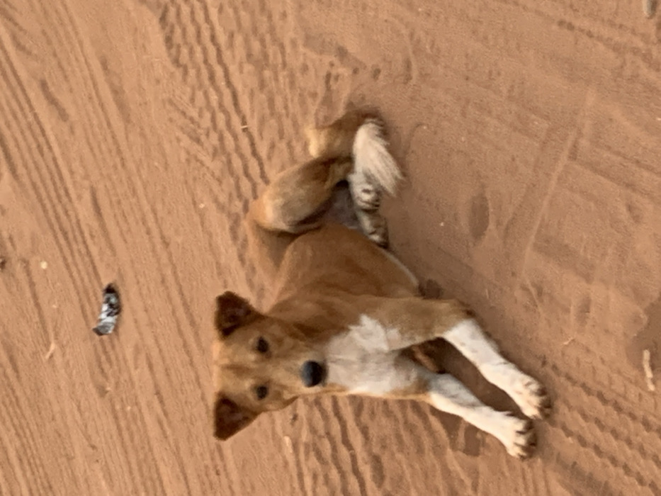 - "An orange dog with white markings is lying on its back in sand" by FM-axXTn1, licensed under CC BY 4.0