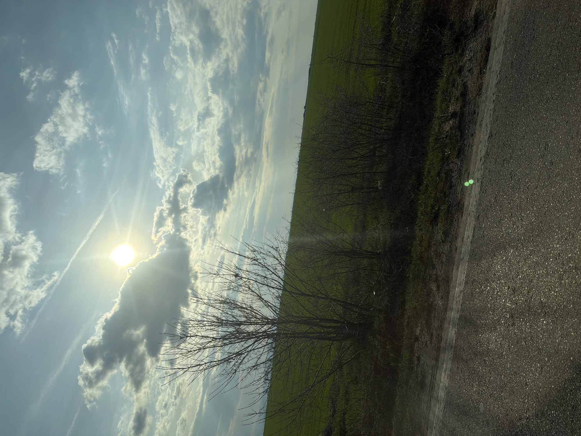 The image displays an outdoor, rural scene located in Topolovets, Bulgaria, under a partly cloudy sky. The sun, a bright circular disc, is positioned in the upper left quadrant, partially obscured by a cloud mass, and emits visible sunrays. The sky features scattered cumulus and stratocumulus clouds of varying density, interspersed with areas of clear blue. The midground is dominated by a gently sloping green agricultural field stretching towards the horizon on the right. In the central left, a prominent bare deciduous tree or large shrub with numerous thin, dark branches stands, silhouetted against the brighter sky. To its right, a cluster of smaller, similar bare bushes or shrubs borders the field. The foreground consists of a dark grey asphalt road surface, showing visible aggregate texture, which occupies the lower third of the frame. A faint, worn light-colored line marks the boundary between the asphalt and a narrow dirt and sparse vegetated verge. Two distinct, circular green lens flares are present on the road surface in the lower right. No individuals, animals, or human actions are depicted in the scene. The lighting indicates daytime conditions.