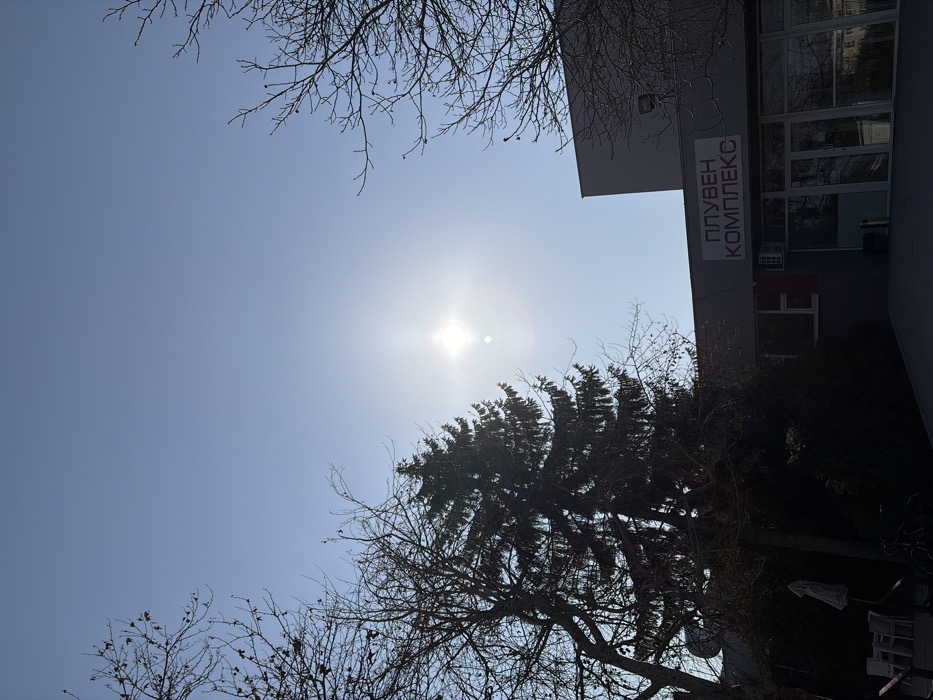 The image depicts an outdoor scene under a clear, bright blue sky with the sun positioned centrally, casting significant lens flare. The primary subject is the entrance facade of a grey building with a multi-pane glass door. Above the entrance, a sign with red Cyrillic lettering reads "ПЛУВЕН КОМПЛЕКС," which translates to "SWIMMING COMPLEX." An air conditioning unit is visible below the sign. To the left of the building, a large, dark green coniferous tree stands prominently, silhouetted against the sky. Bare deciduous tree branches frame the left and upper right sections of the image. In the lower left foreground, partially obscured, are outdoor white patio furniture including an umbrella, tables, and chairs. A taller, plain grey structure rises behind the main building on the right. No people are visible. The location is identified as the Plovdiv Swimming Complex in Plovdiv, Bulgaria.
