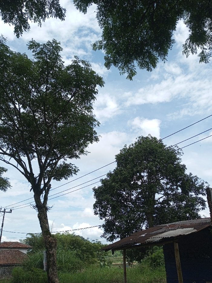 Lush green trees dominate the frame against a backdrop of a partly cloudy sky. Power lines cut across the scene, adding a touch of the modern world. A rustic, weathered structure with a corrugated roof stands partially visible on the right side, near tall grass. A glimpse of a tiled roof hints at nearby dwellings. The composition evokes a sense of serenity, juxtaposing nature with human elements.