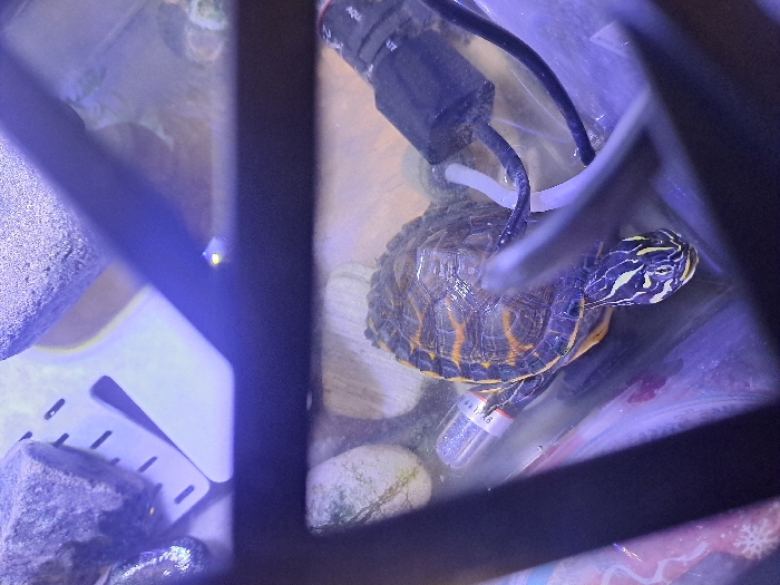 The scene depicts an aquatic enclosure located in Slivnitsa, Bulgaria. The primary subject is a semi-aquatic turtle, likely a Red-eared slider, identifiable by its dark carapace featuring orange and yellow markings, and its dark head adorned with distinct yellow stripes. The turtle is partially submerged in clear water. Within the enclosure, several grey rocks are visible, including a large, irregularly shaped rock in the upper left quadrant. A white plastic ramp or platform with vertical slits is situated beneath a rock in the upper left. Submerged aquatic equipment includes a cylindrical submersible heater, labeled "10W", positioned near the turtle's left side, and a black filter pump with black and white tubing/cords located to the turtle's right. The bottom of the tank is covered with light-colored pebbles or substrate. The environment is illuminated by an overhead artificial light source, casting a bluish hue. The image is captured from an elevated perspective, looking down into the tank, with a dark horizontal structural bar obscuring a segment of the upper frame. No people or overt interactions are visible.