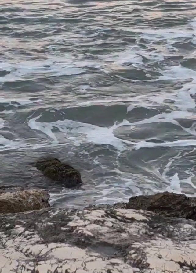 The video depicts an expanse of water, with small waves gently lapping against a rocky shoreline. The water appears gray and interspersed with white foam. The rocks in the foreground are light gray, with visible texture and patterns. The overall view presents a natural coastal scene.