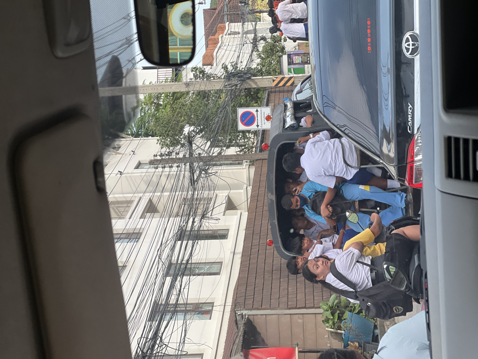 The image displays a street scene in the city of Baan Bo Phut, Thailand, viewed from the interior of a vehicle. The foreground shows a car's dashboard, a sun visor, and a rearview mirror reflecting a circular architectural element. In the midground, a dark-colored songthaew, a converted pickup truck with a covered bed, is filled with approximately ten individuals. Most occupants are male students wearing white uniform shirts, while one male in the center wears a light blue polo shirt and a blue face mask. Some students are seated on benches within the truck, and at least one is sitting on a motorcycle positioned inside the truck bed. A female individual, possibly a student, with long dark hair, wearing a white shirt and dark skirt, carrying a black backpack, is seated on a yellow scooter to the immediate left of the songthaew, looking towards the camera. Behind the songthaew, a dark-colored Toyota Camry sedan is partially visible. The background features a multi-story, light-colored building with numerous rectangular windows, against which a dense network of black electrical and communication wires is strung between utility poles. A blue circular traffic sign with a red diagonal bar and dual arrows, signifying a no-parking or no-stopping zone, is attached to a utility pole. Green trees and additional buildings with reddish roofs are visible further down the street on the right, along with more people, some appearing to be students.