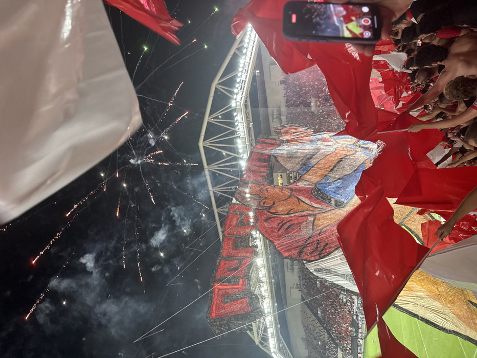 The image depicts a nighttime scene within Bloomfield Stadium in Tel Aviv-Yafo, Israel. Red and white fireworks are actively detonating in the dark sky above the stadium, emitting trails of light and smoke. The stadium's illuminated white truss roof structure is visible against the night. Below, a massive multi-colored tifo, predominantly red, white, and blue, is unfurled across multiple sections of the stadium stands. This tifo features a large stylized depiction of a male figure in a red shirt, with an accompanying red banner displaying Hebrew text, consistent with "הפועל" (Hapoel), above it. The stadium stands are densely populated with a large crowd of spectators, many of whom are wearing red attire. In the immediate foreground, numerous red flags, along with a few white ones, are being enthusiastically waved by individuals whose arms are raised. A hand in the bottom right holds a smartphone vertically, actively recording the scene on its screen.