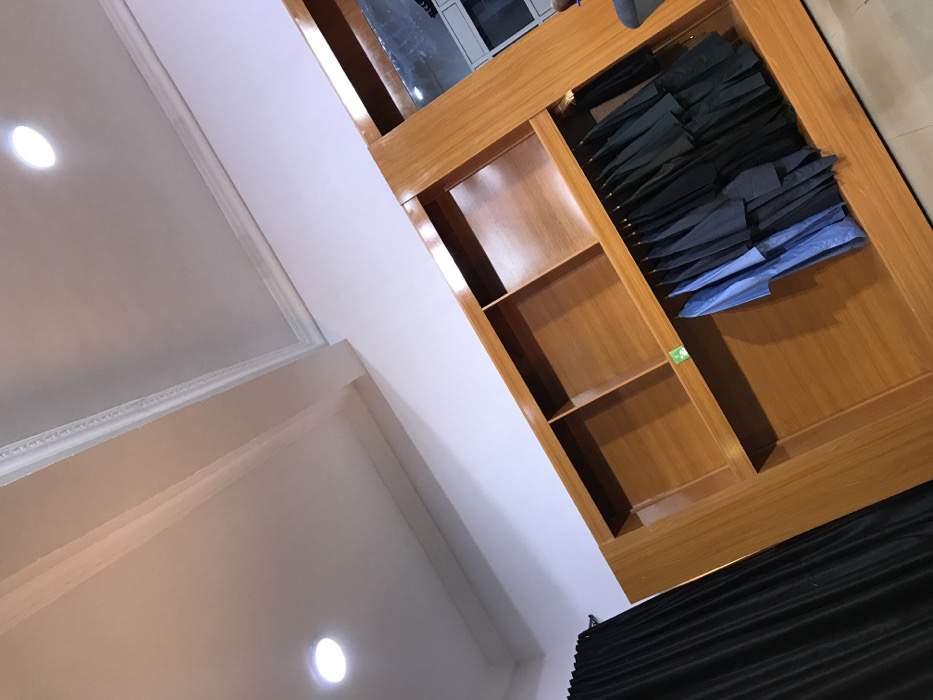 This image depicts an interior retail or storage space, purportedly located in Gura Top, Nigeria. The scene is dominated by a large, light-brown wooden fixture positioned against a white wall, serving as both shelving and a clothing rack. The upper section of this fixture contains multiple empty, rectangular cubbies of varying sizes. Below these shelves, a clothing rail holds garments. Approximately four light blue uniform garments hang on the left side of the rail, followed by a larger collection of numerous dark-colored, uniform robes or gowns, appearing black or very dark blue/green. A small green rectangular label is affixed to the wooden fixture above the hanging clothes. The white ceiling features two bright, circular recessed light fixtures and decorative molding along its edges. A black curtain or drape is visible along the far left edge of the frame. On the far right, a partial view through an opening reveals a dimly lit area or exterior with a light-colored structure. No people, actions, or direct interactions are visible.