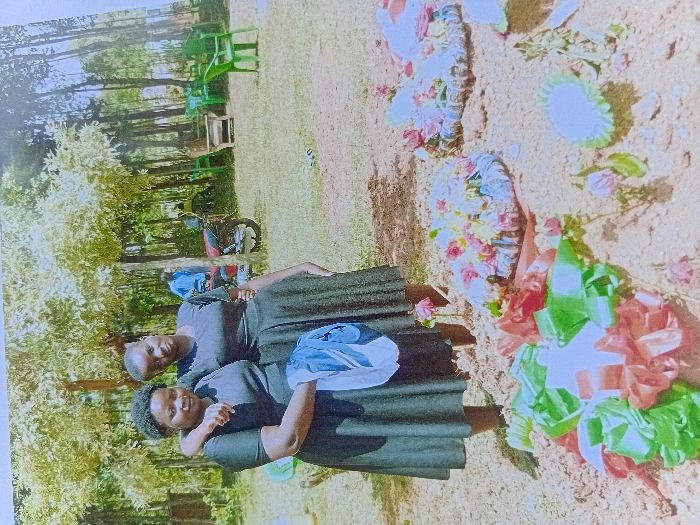 In Manda-Shivanga ward, Kenya, an outdoor scene depicts two women standing on freshly disturbed, reddish-brown earth, which is adorned with multiple floral arrangements and loose flowers, indicating a grave site. Both women wear dark, short-sleeved dresses. The woman on the left, with dark, curly hair, holds a light blue piece of fabric. The woman on the right, with short dark hair, has her right arm around the left woman's shoulder. In the middle distance, behind the women, a man in a blue shirt stands next to a red motorcycle. The background consists of a treeline with light green foliage, a grassy area, and a collection of seating, including a light wooden chair and two green plastic chairs.